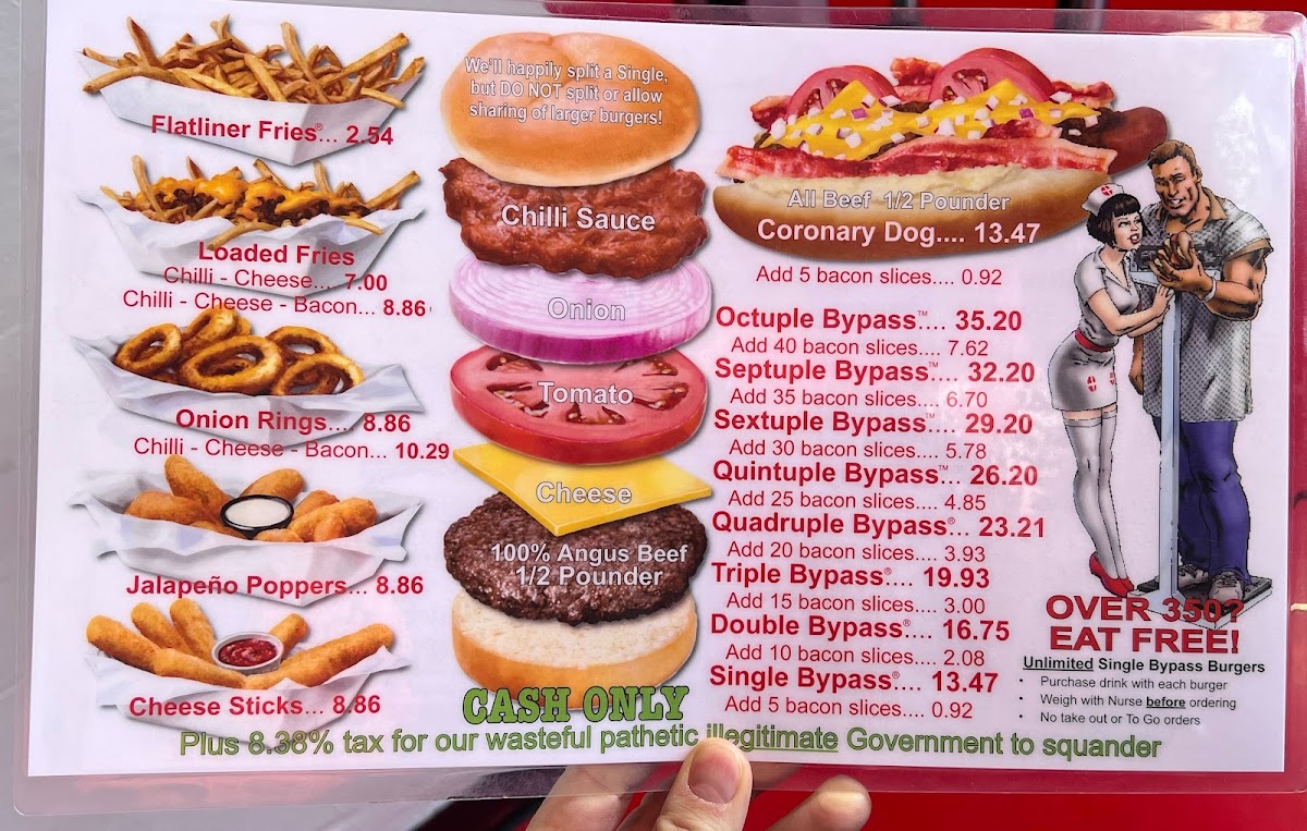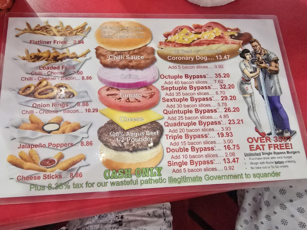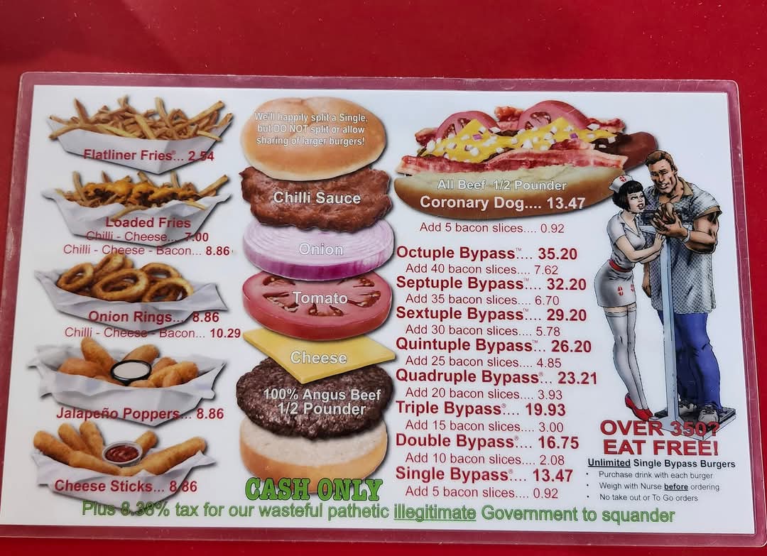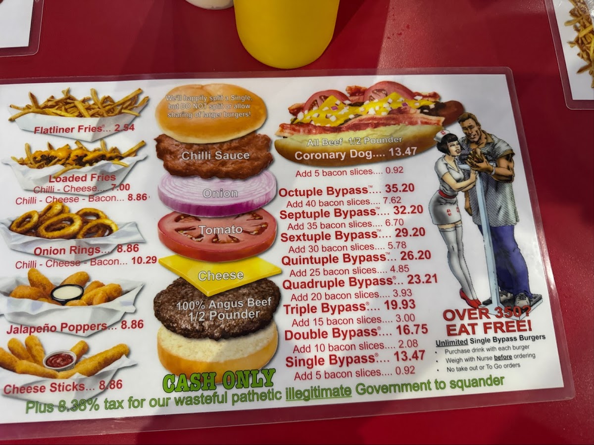 We came to Heart Attack Grill with ambition and left with a sense of defeat... and slightly bruised. Ordered the smallest burger and a hot dog... and couldn’t finish them. We got spanked—because rules are rules. Now we’re not sure what hurts more—our pride or our backside. The atmosphere , the portions , the waitresses . Highly recommend this place to anyone looking to test their limits and have an unforgettable experience... in every sense. A must-visit for those who want to challenge their willpower, stomach capacity, and self-respect. We failed, but we might come back for a rematch. Or not...