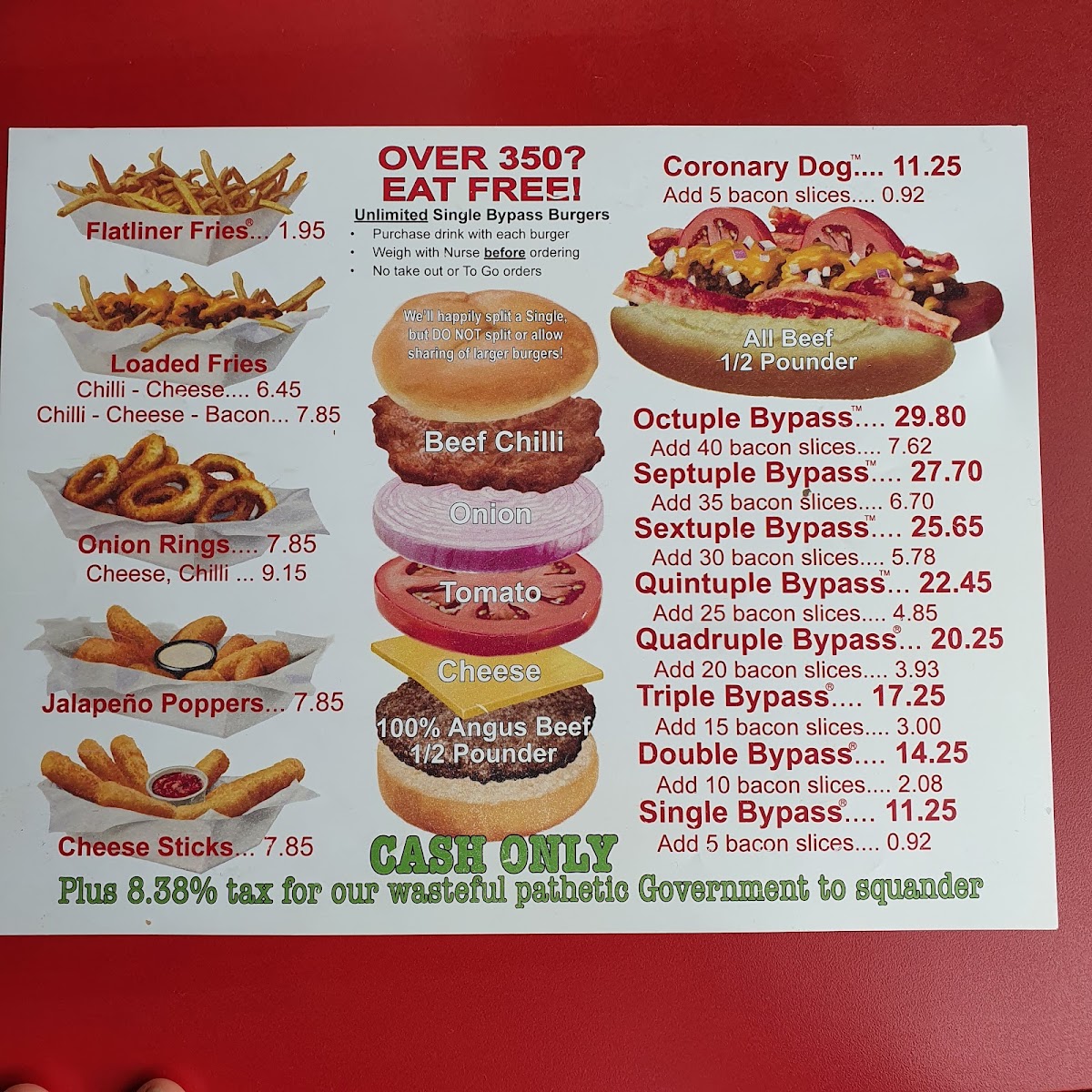 The place was pretty empty when we went. Most likely do to it being cash only ! We passed by later that day, and it was the same. I got the double bypass burger with 10 strips of bacon . The burger was great ! I also got a 750ml shot of pina colada, that was great as well. Don't finish your burger, then you get spanked pretty hard . I would go back. They would do a better business if they accepted charge cards, just add an extra 3%.